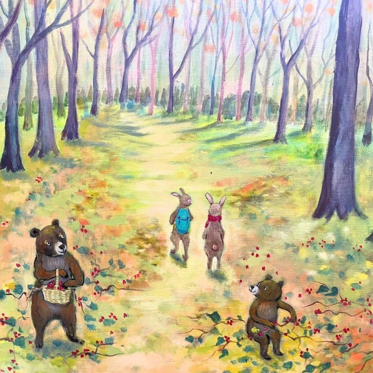 猫を飼い始めたころから、猫を描くようになり、2015年からは他の動物たちも絵の中に参加するようになりました。主に、動物や自然、里山などをテーマにイラストや絵を描いています。